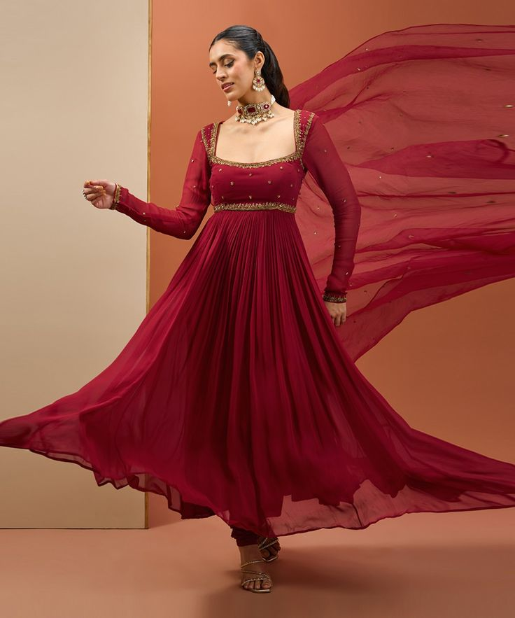 A full-length, flowy dress with rich embroidery, perfect for weddings and grand events. It offers a regal look with luxurious fabrics like silk, velvet, or georgette.